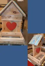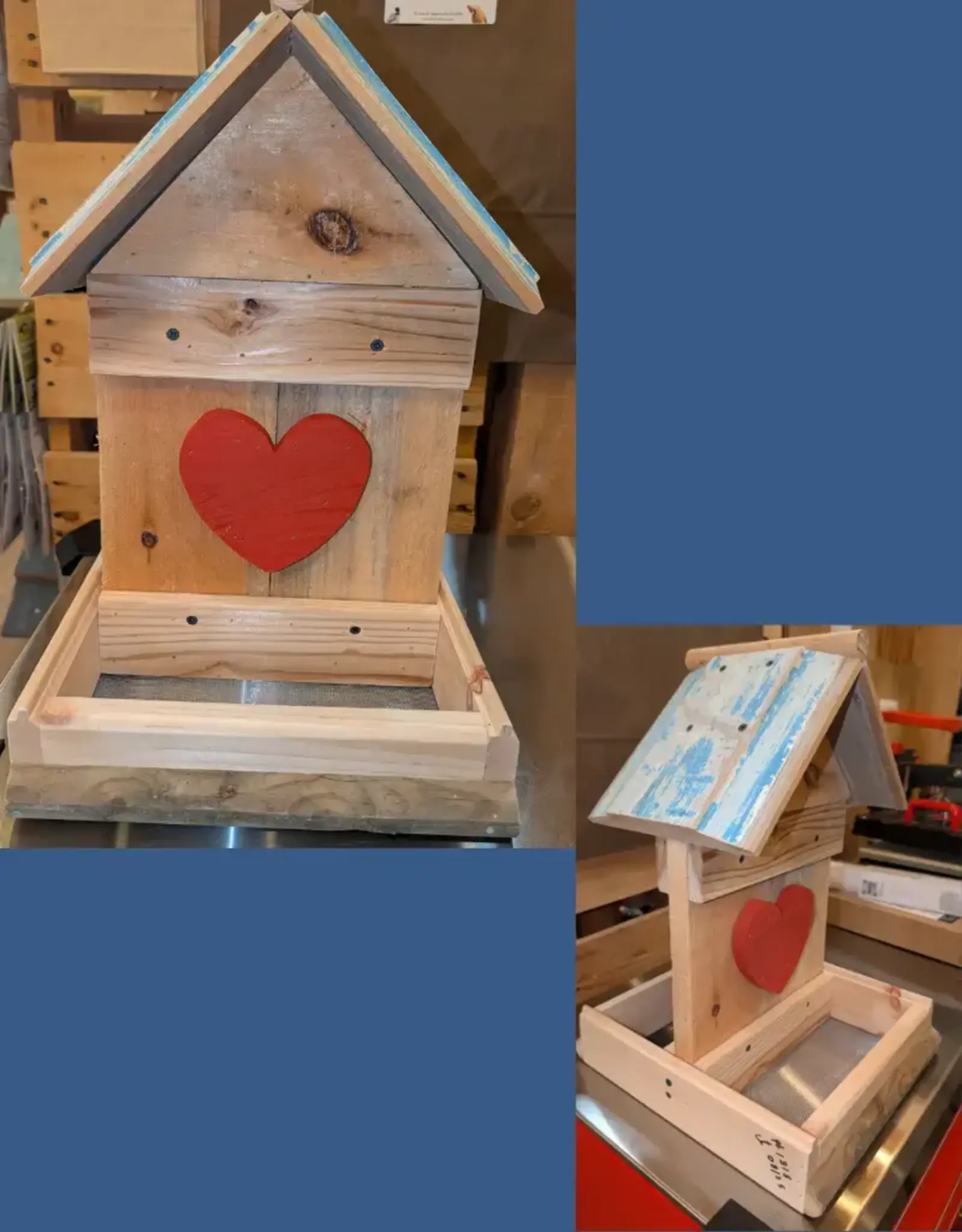 Double sided platform feeder, red heart, blue roof.